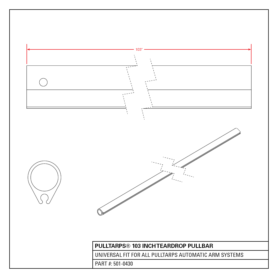 This universal fit 103 inch teardrop pullbar works on all Pulltarps Automatic truck tarp systems. This rear crossbar attaches to both of our Pulltarps steel elbows and aluminum elbows, which connect to manual or automatic arms. This bar holds any Pulltarps tarp, as it slides into the tarp loop. The teardrop pullbar is able to be cut to fit your exact truck bed width and specifications.