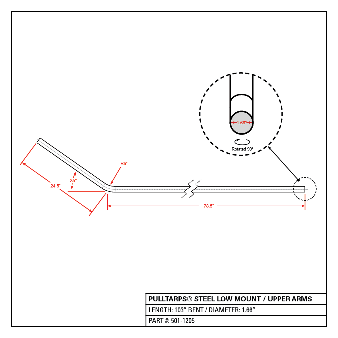 Our 103 inch long upper arm is made of galvanized steel. The diameter runs 1.66″ across, making this replacement part universal fit for most housing assemblies. Upper arm maintains a 35 degree bend 24″ from the top side, with the long side measuring 79″ long. 103 inch steel arm conveniently ships pre-drilled.