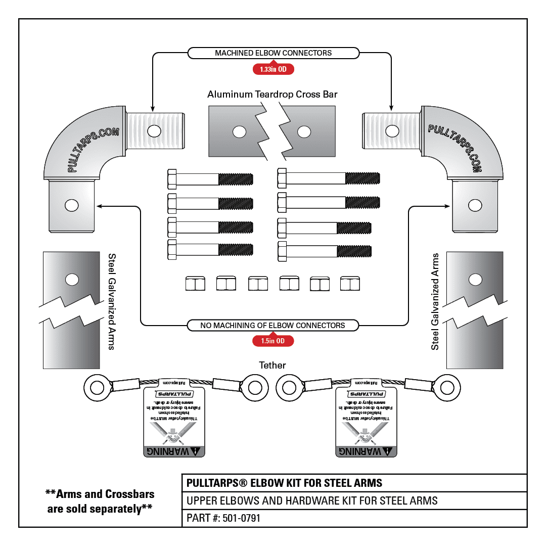 Pulltarps Elbow Kit and Hardware For Steel Arms connecting to an Aluminum Teardrop Crossbar.
